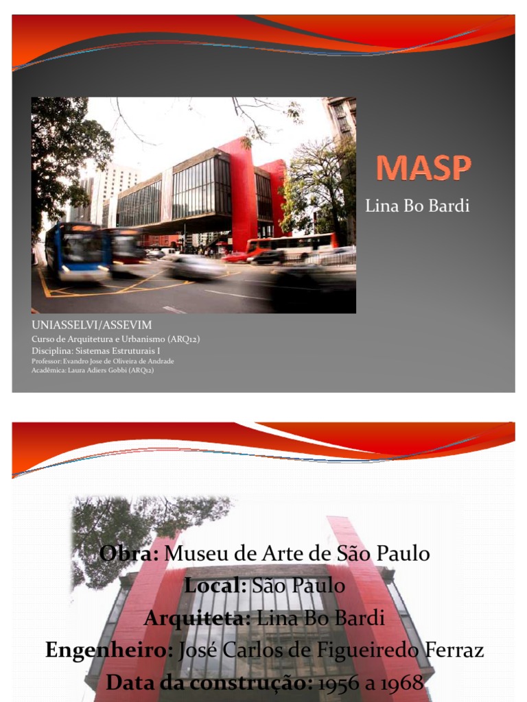 Obra: Museu de Arte de So Paulo Local: So Paulo Arquiteta: Lina Bo Bardi Engenheiro: Jos Carlos de Figueiredo Ferraz Data da construo: 1956 a 1968