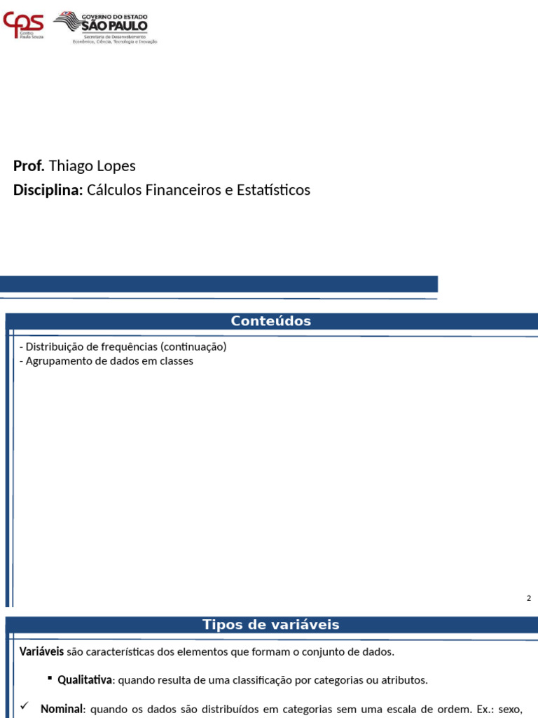 Discreta: quando assume somente números inteiros (0, 1, 2, 3...), resultado de uma contagem. Ex.: