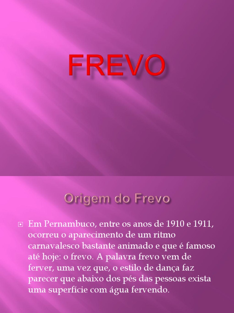 Em Pernambuco, entre os anos de 1910 e 1911, ocorreu o aparecimento de um ritmo carnavalesco bastante animado e que famoso at hoje: o frevo.