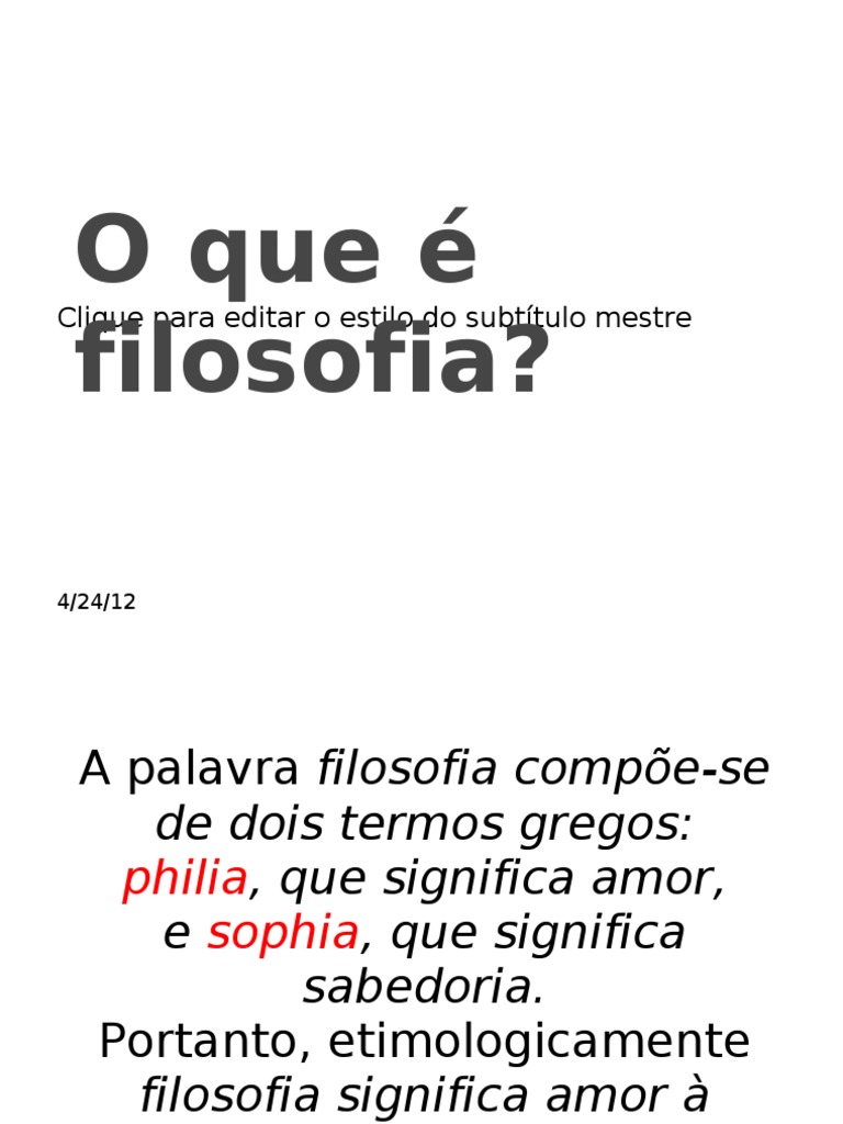 A palavra filosofia compe-se de dois termos gregos: philia, que significa amor, e sophia, que significa sabedoria. Portanto, etimologicamente filosofia significa amor sabedoria. Contudo, isso no explica muita 4/24/12
