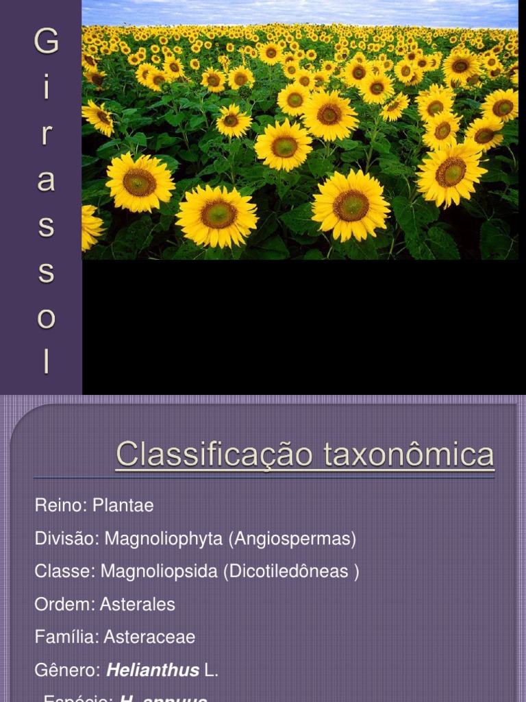 Dicotilednea anual Gnero deriva do grego helios, que significa sol, e de anthus, que significa flor. Ou seja : "flor de sol".