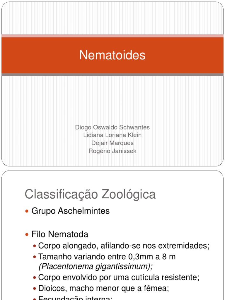 (Placentonema gigantissimum); Corpo envolvido por uma cutcula resistente; Dioicos, macho menor que a fmea; Fecundao interna; Trato digestrio completo; Simetria bilateral;